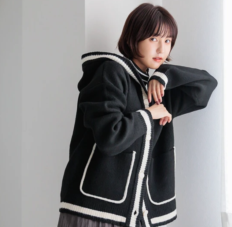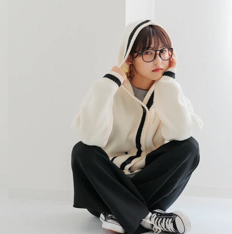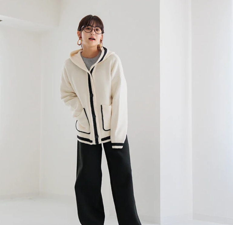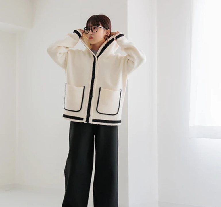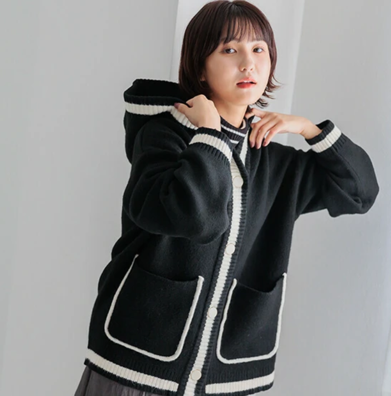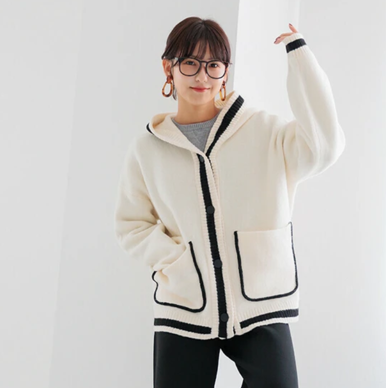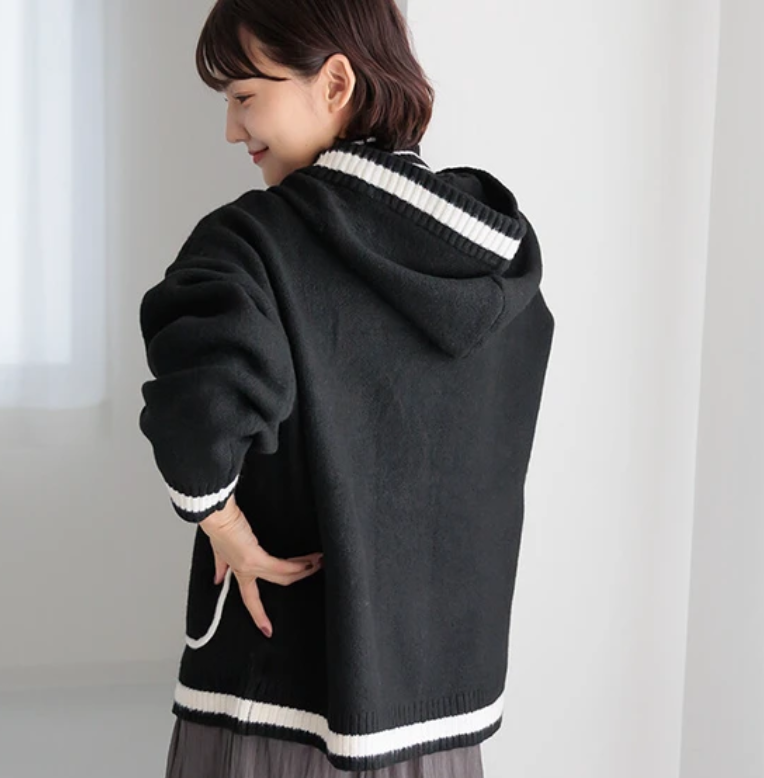 V領撞色針織連帽開襟