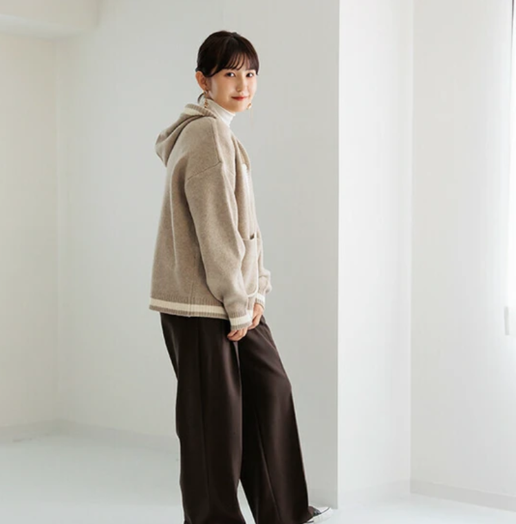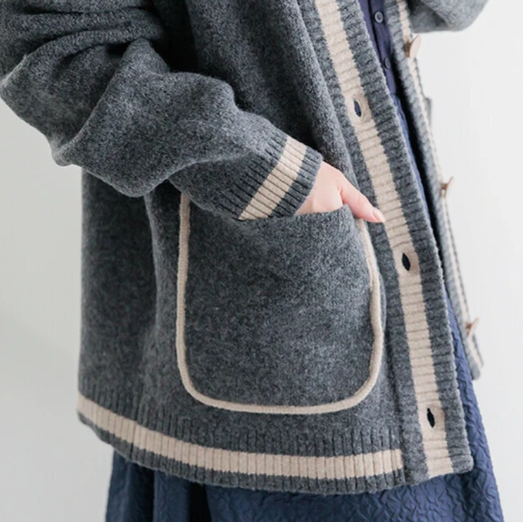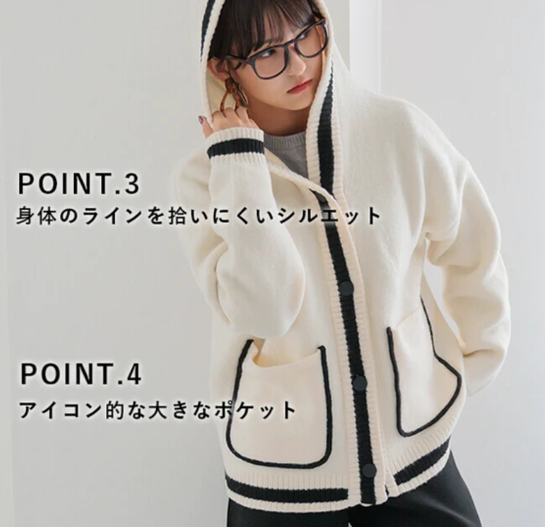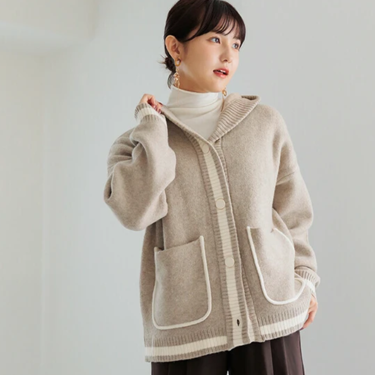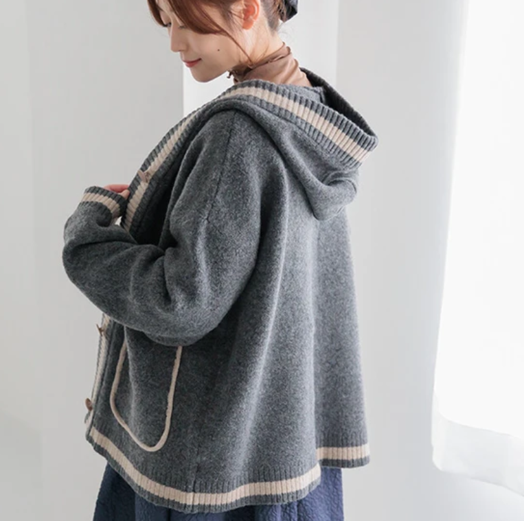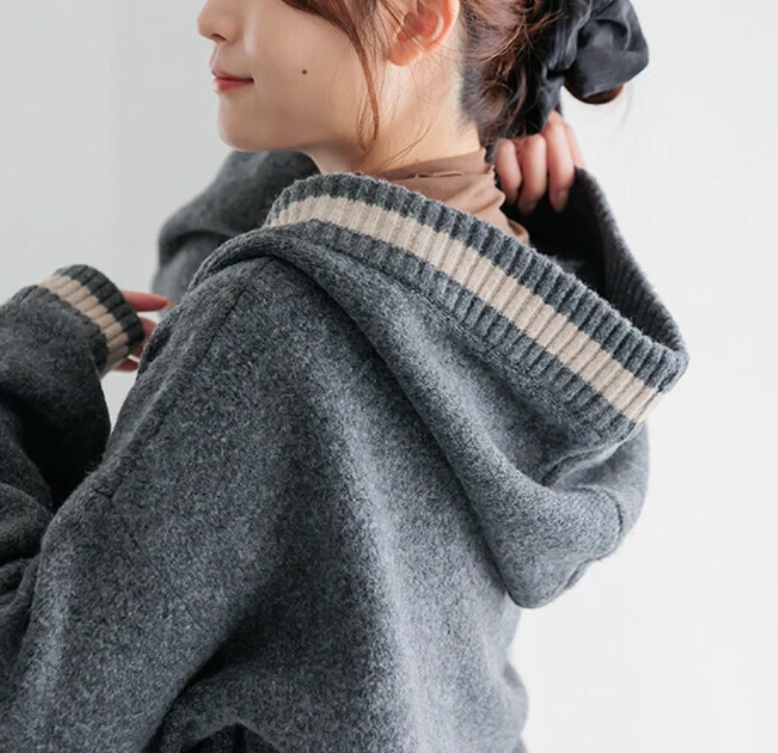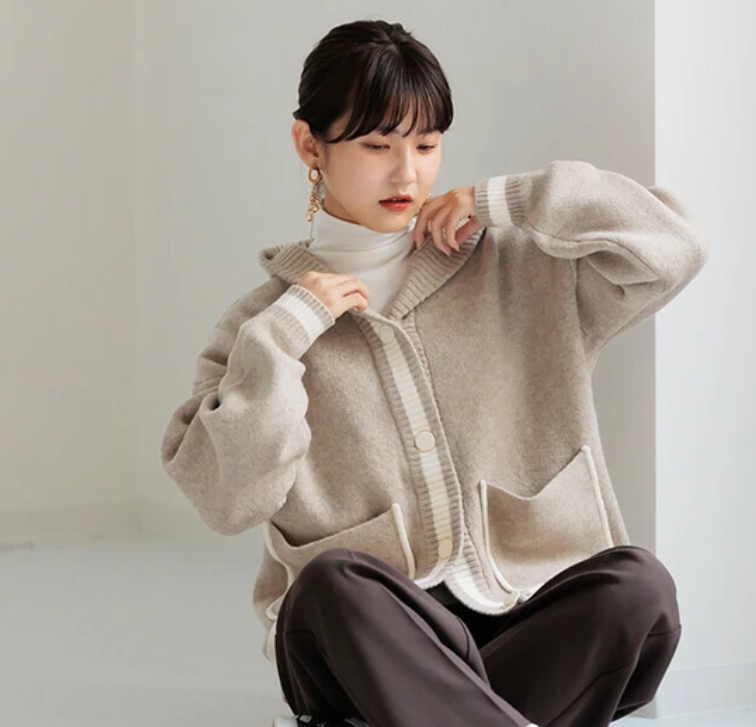 V領撞色針織連帽開襟